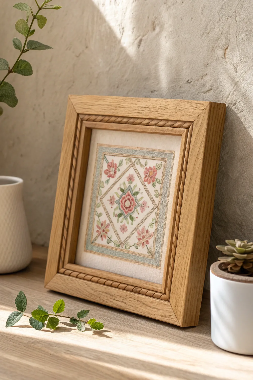 I love using rustic wooden frames to give my needlepoint projects a warm, classic look. The natural textures complement earthy tones beautifully and create a cozy vibe in any room.