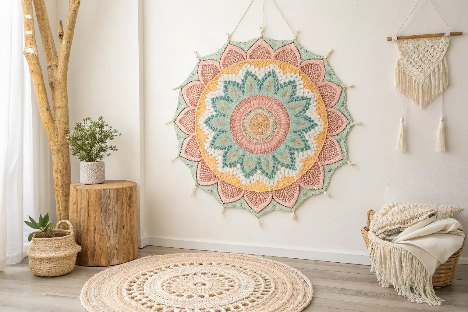 Add a touch of bohemian flair to your decor with a crochet wall hanging. In line with other aesthetic crochet ideas, combining different yarn textures and colors can turn a simple pattern into a striking piece of art.