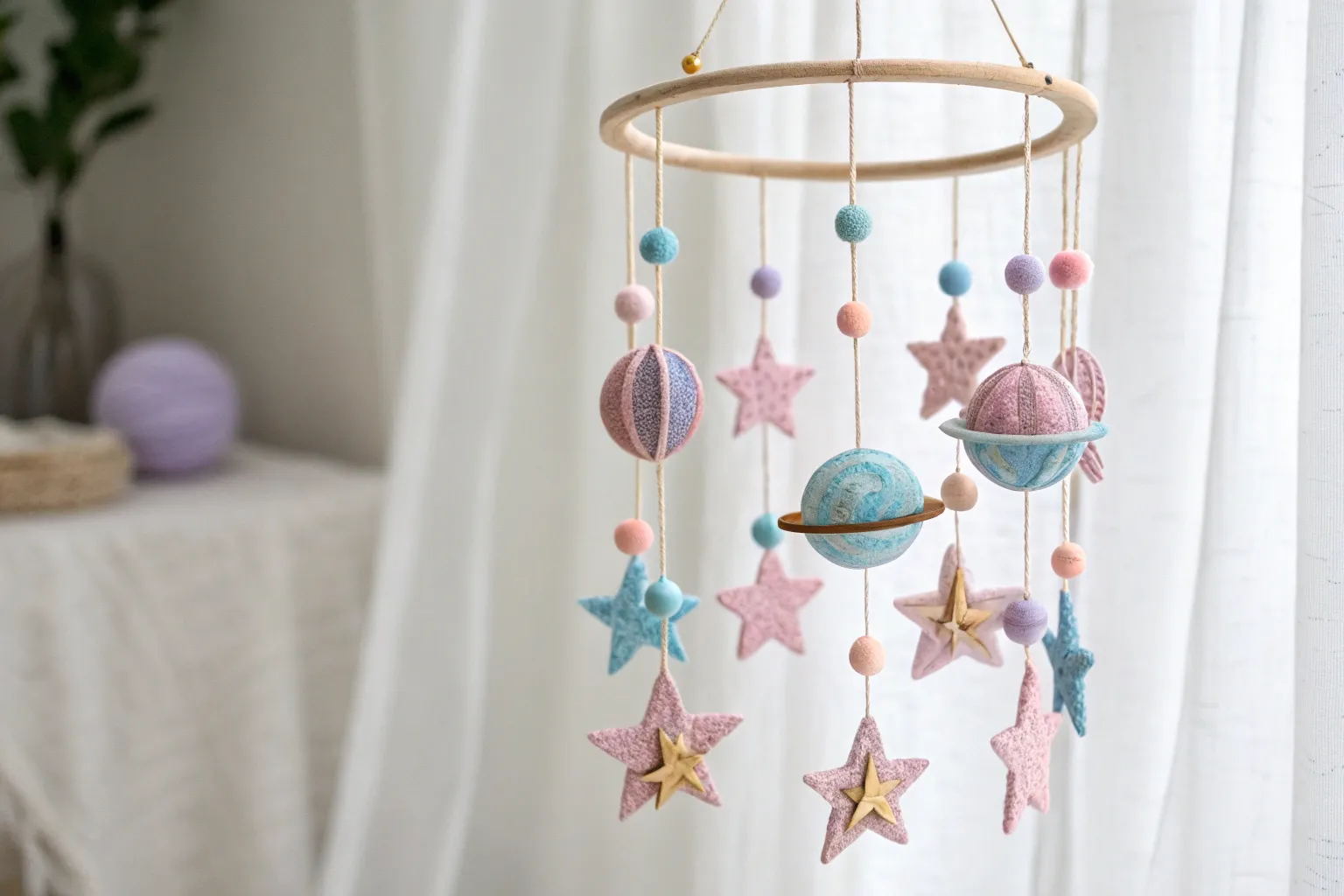 Use pom-poms and string to design a planet orbit mobile. It’s a fun project that adds a pop of color and movement to any room.