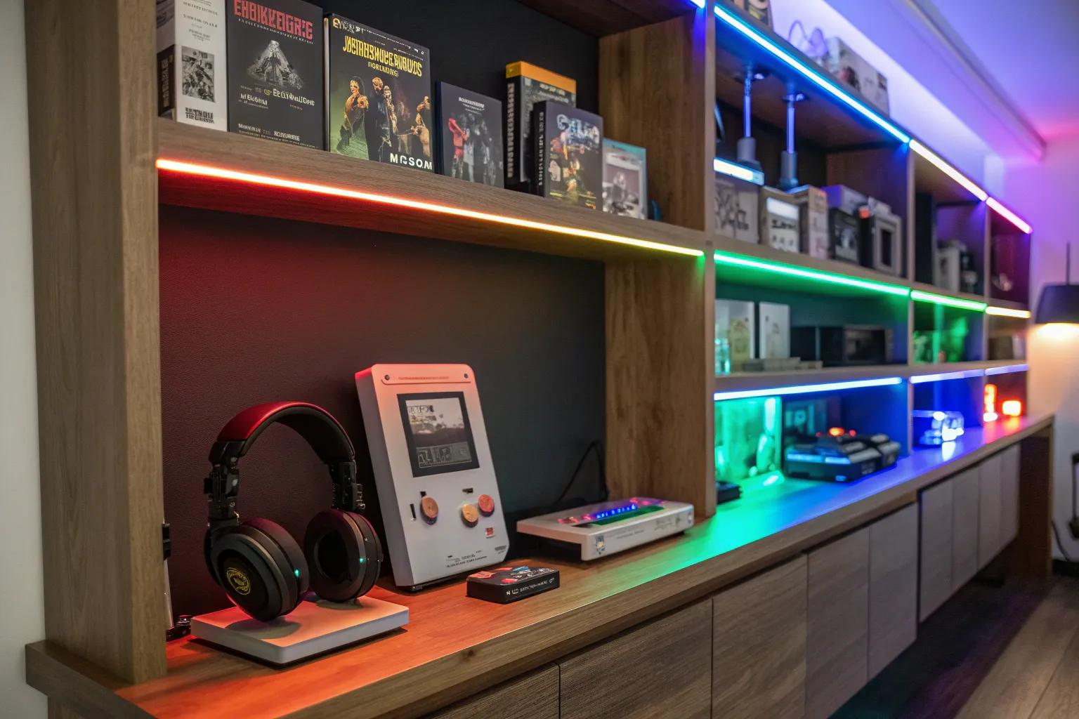 Add a splash of color and excitement to your gaming room with RGB lighting. I’ve found that these lights not only enhance the mood but also make your shelves pop with personality.