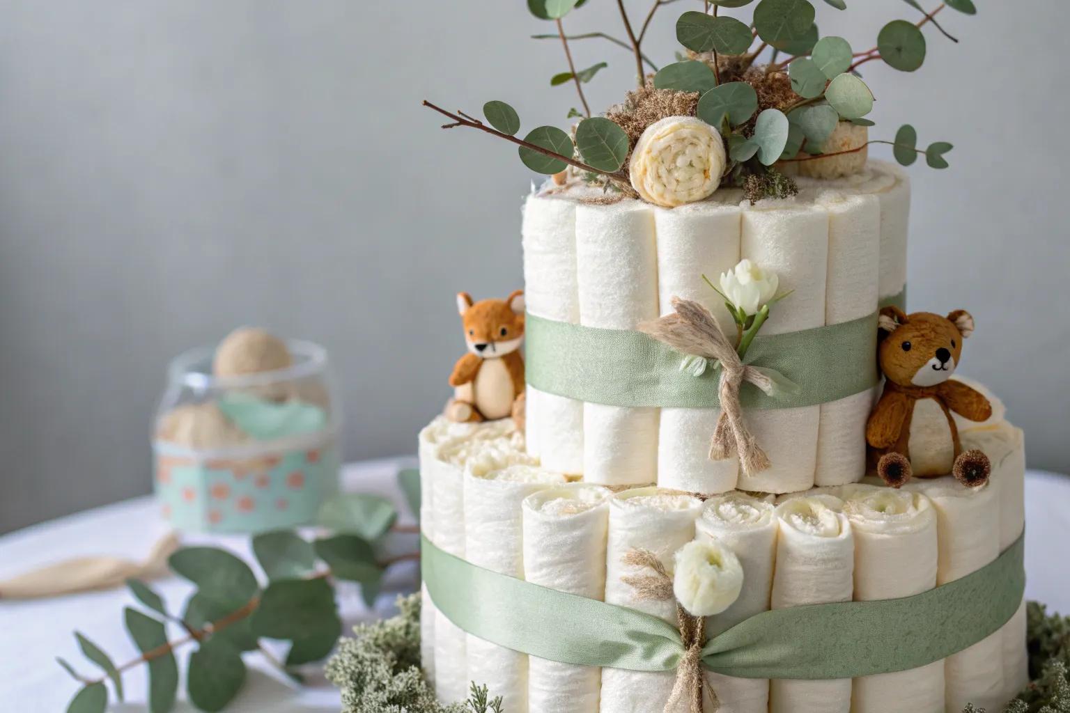 Why not bring a touch of the outdoors inside with a nature-themed diaper cake? Use elements like faux leaves, earthy tones, and cute little animal figures to tie it all together.