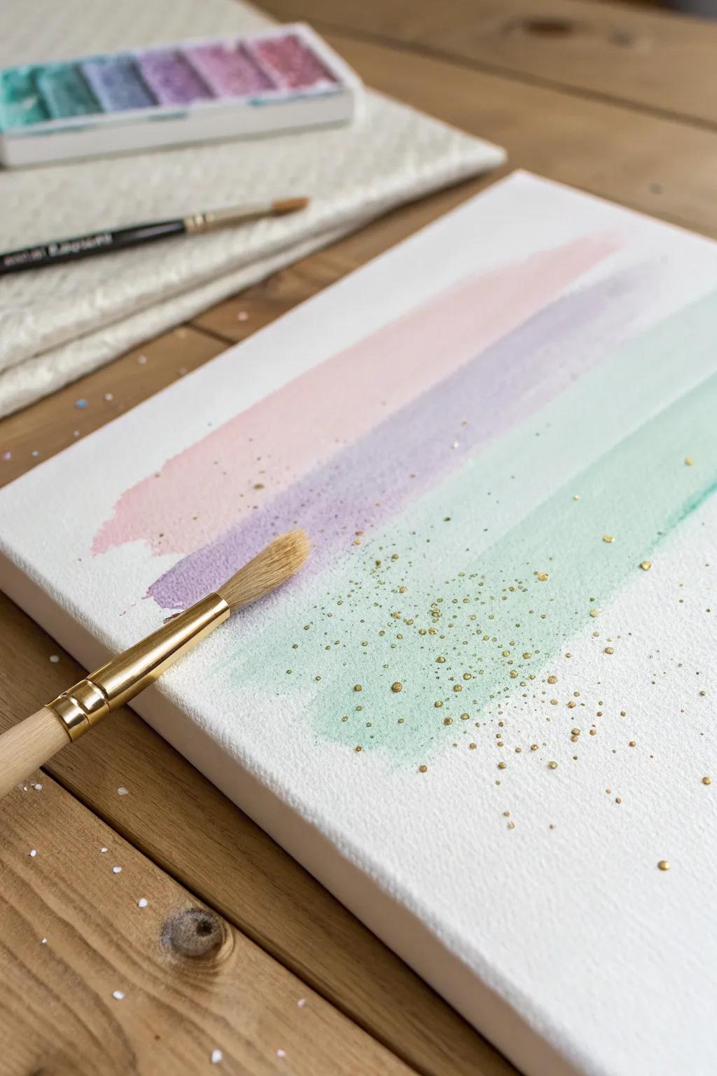 Combine the soft flow of watercolors with the brilliance of glitter for a delicate yet striking piece. For more inspiration, explore these other creative painting ideas. I adore how the glitter adds a hint of magic to the watercolors’ fluidity.