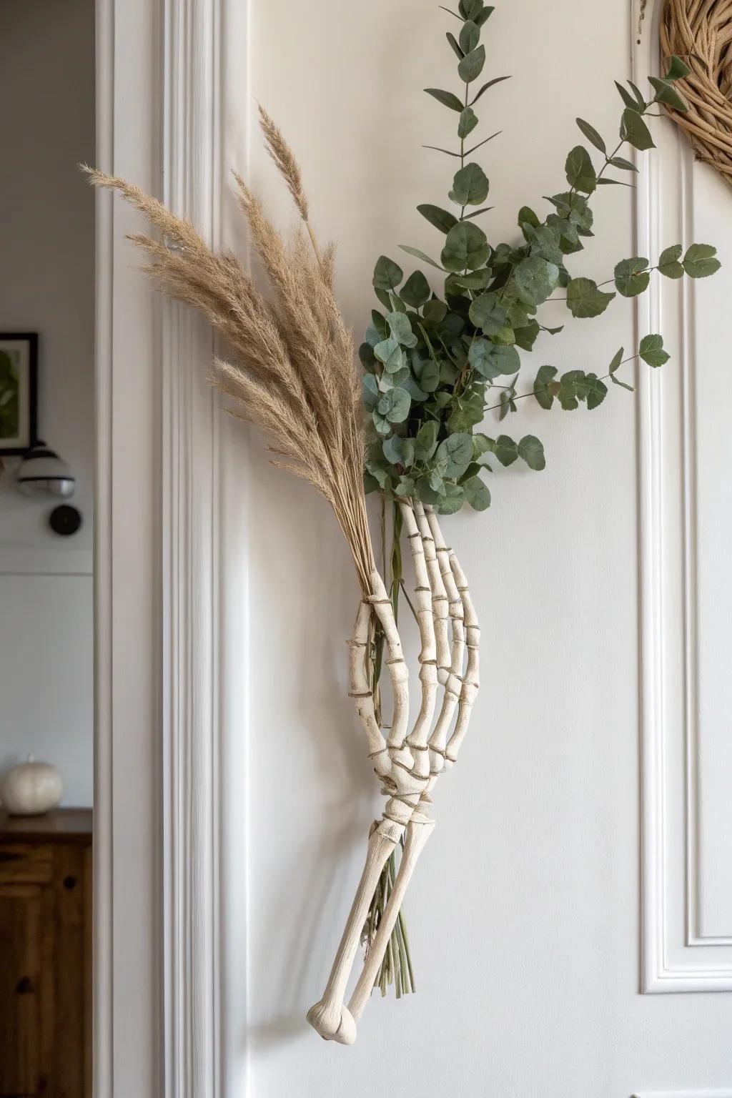 Craft a spooky wall vignette using skeleton hands to hold flowers or keys. I adore how this project adds a playful yet eerie element to any wall.