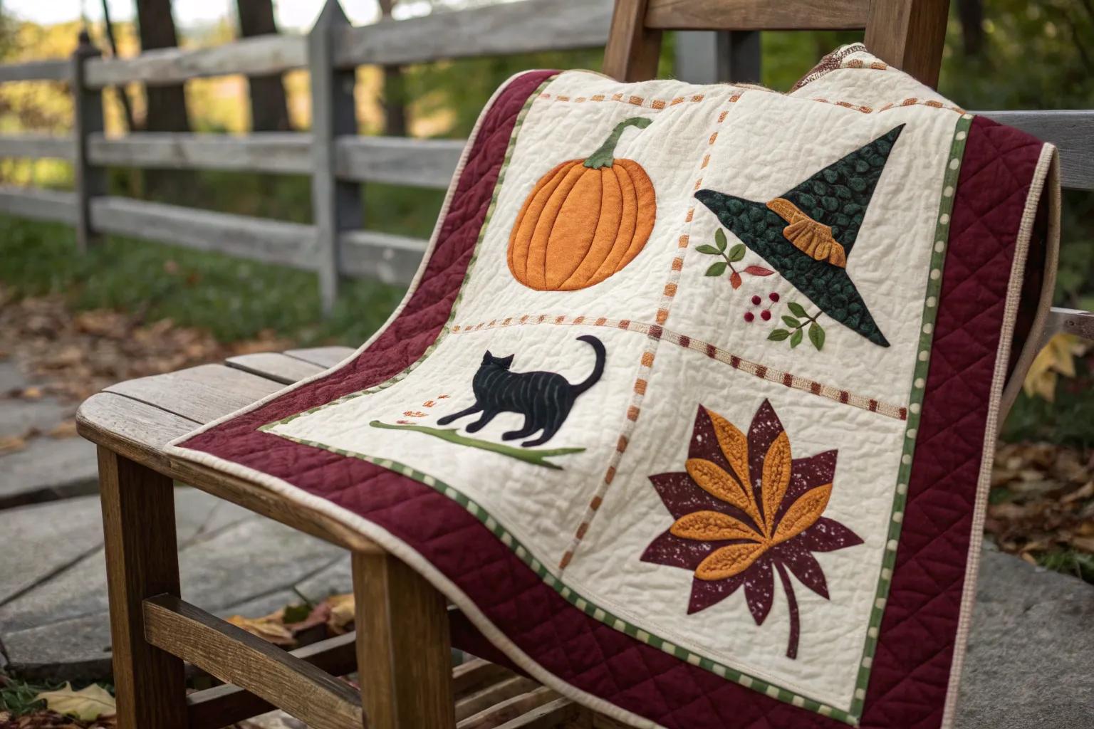 Add some fun with ghost-shaped quilt blocks. I once crafted a mini quilt with playful ghosts that seemed to float right off the fabric, which could even inspire some DIY Halloween costume ideas.