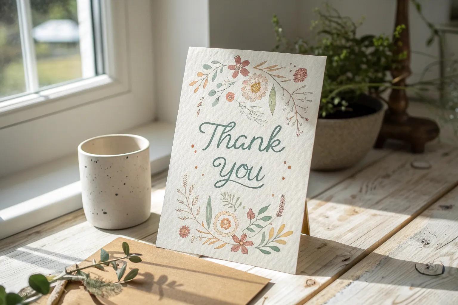 A beautifully styled ‘Thank You’ in creative typography can be the centerpiece of your card. I love experimenting with cursive and bold fonts to make the words pop.