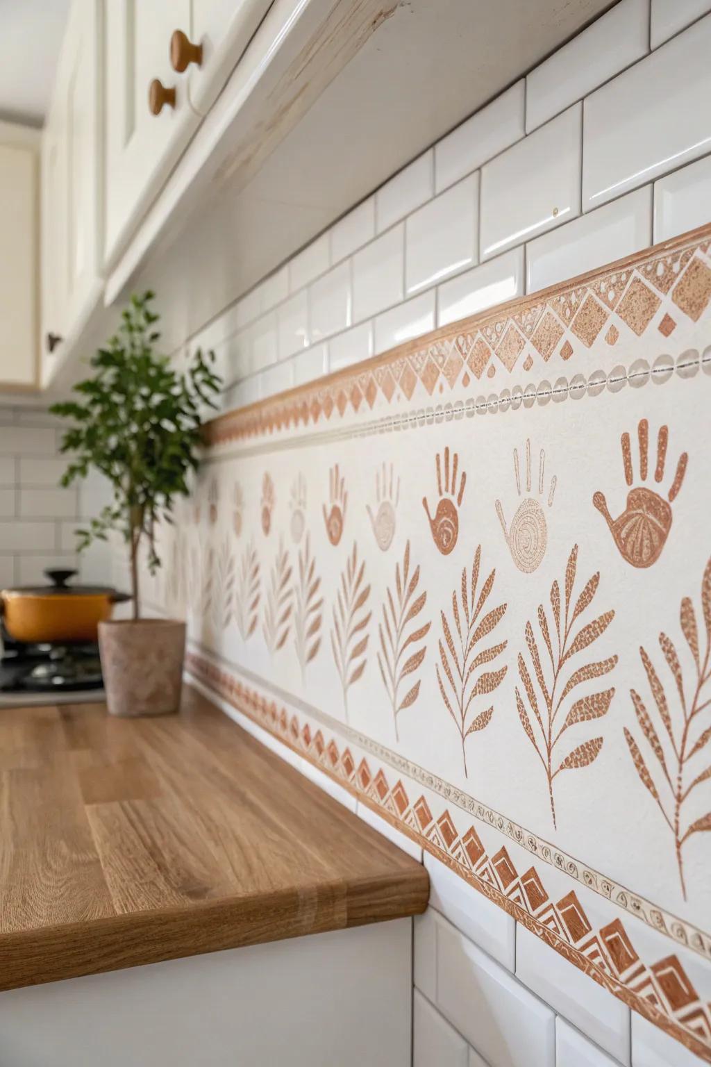Use hand and fingerprints to design a unique border for your walls. You can apply a similar personalized style with these hand-painted bookcase ideas. I did this in my kitchen, and it adds such a cozy, personalized touch.