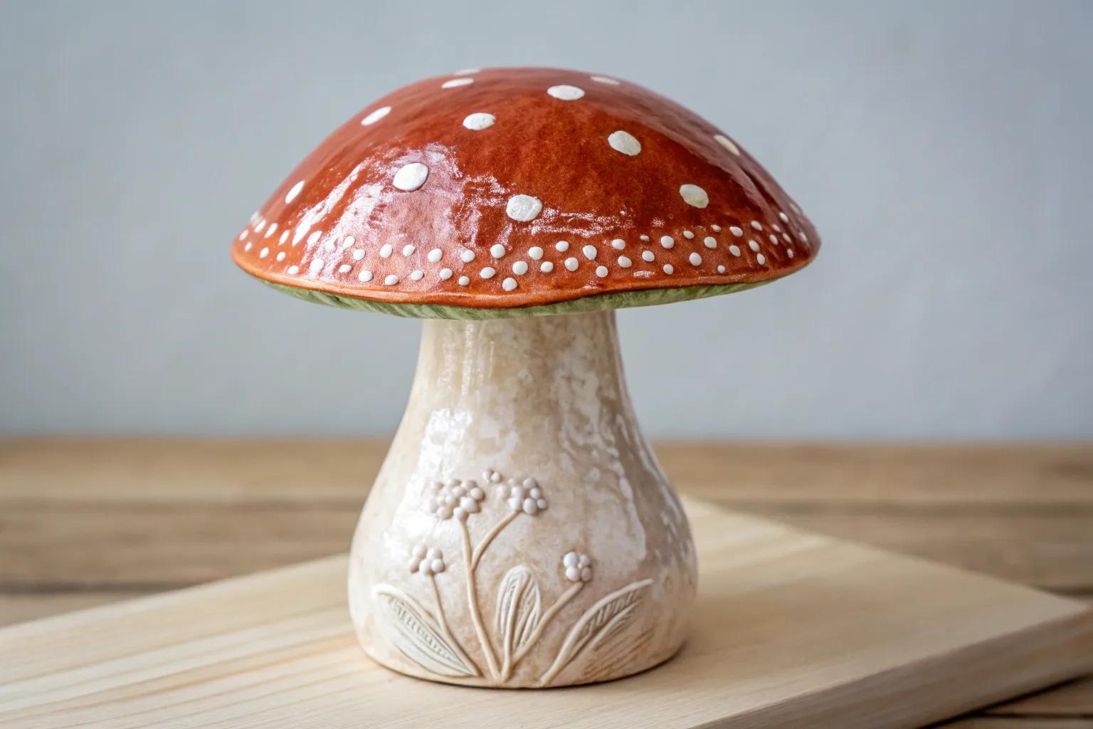 - Artisan Crafted Mushroom Statue: Introduce handcrafted beauty to your shelf or mantle with this artisan ceramic mushroom statue.