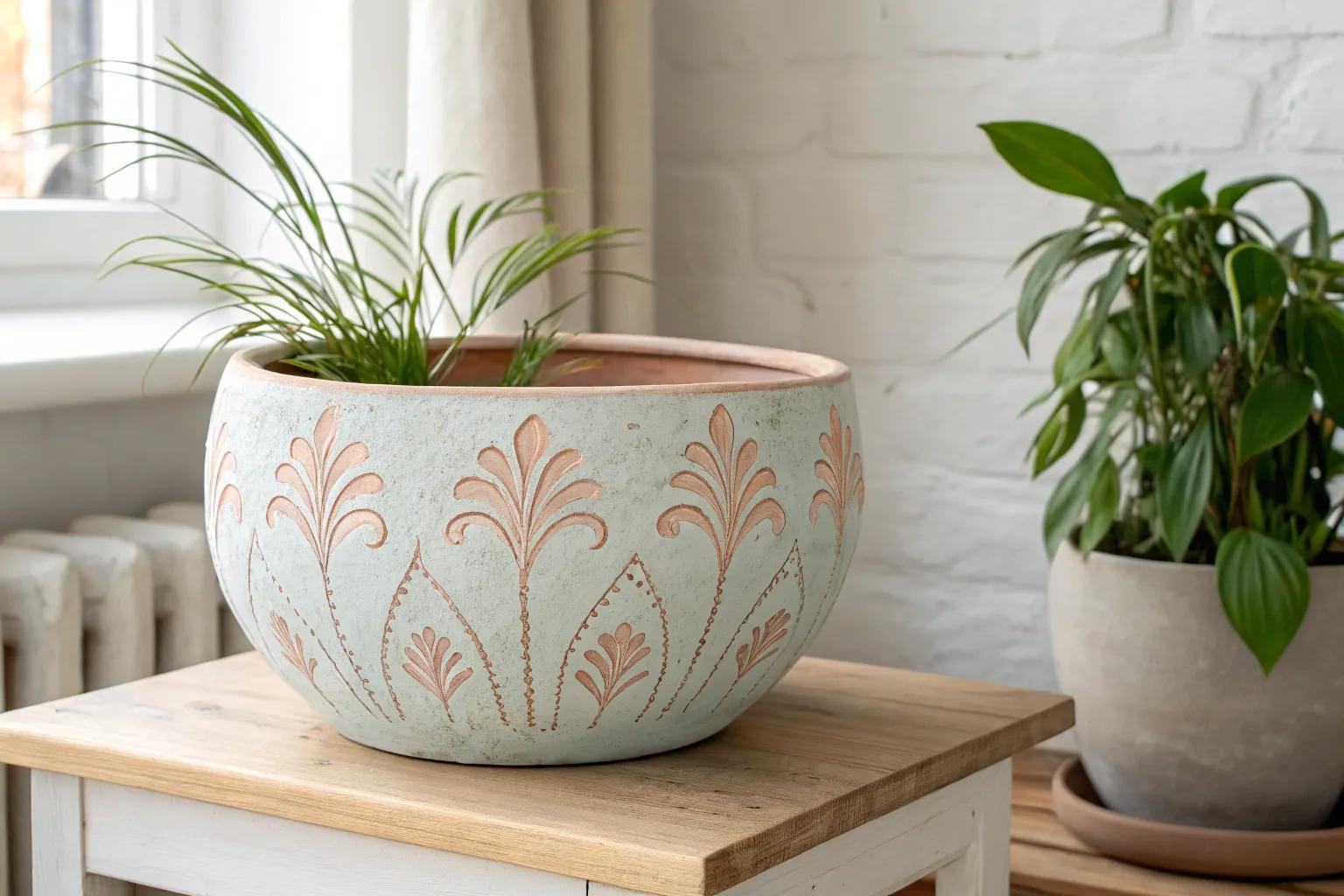 Impress unique textures onto your clay with stamps or leaves. I’ve found that nature-inspired patterns look especially lovely on my shelf, and there are many more personalized clay planter ideas to explore.