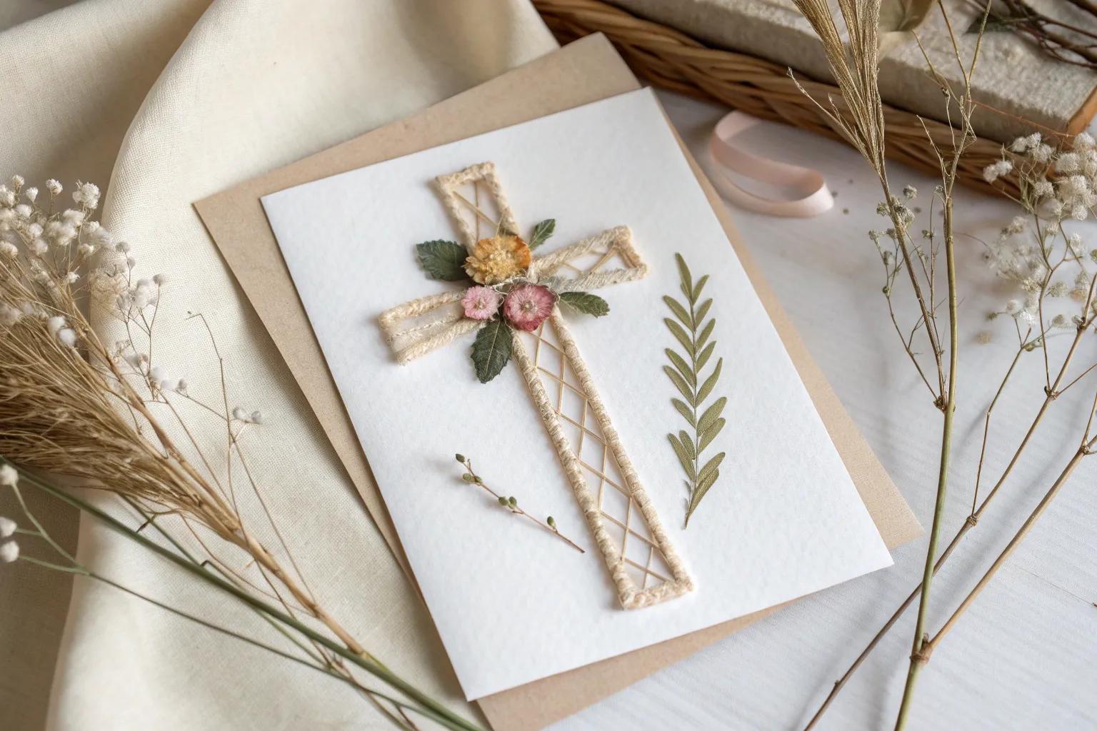 Add a touch of nature with pressed flowers arranged around a cross or religious verse. This is a favorite of mine for its simplicity and elegance, bringing a bit of springtime into each card.