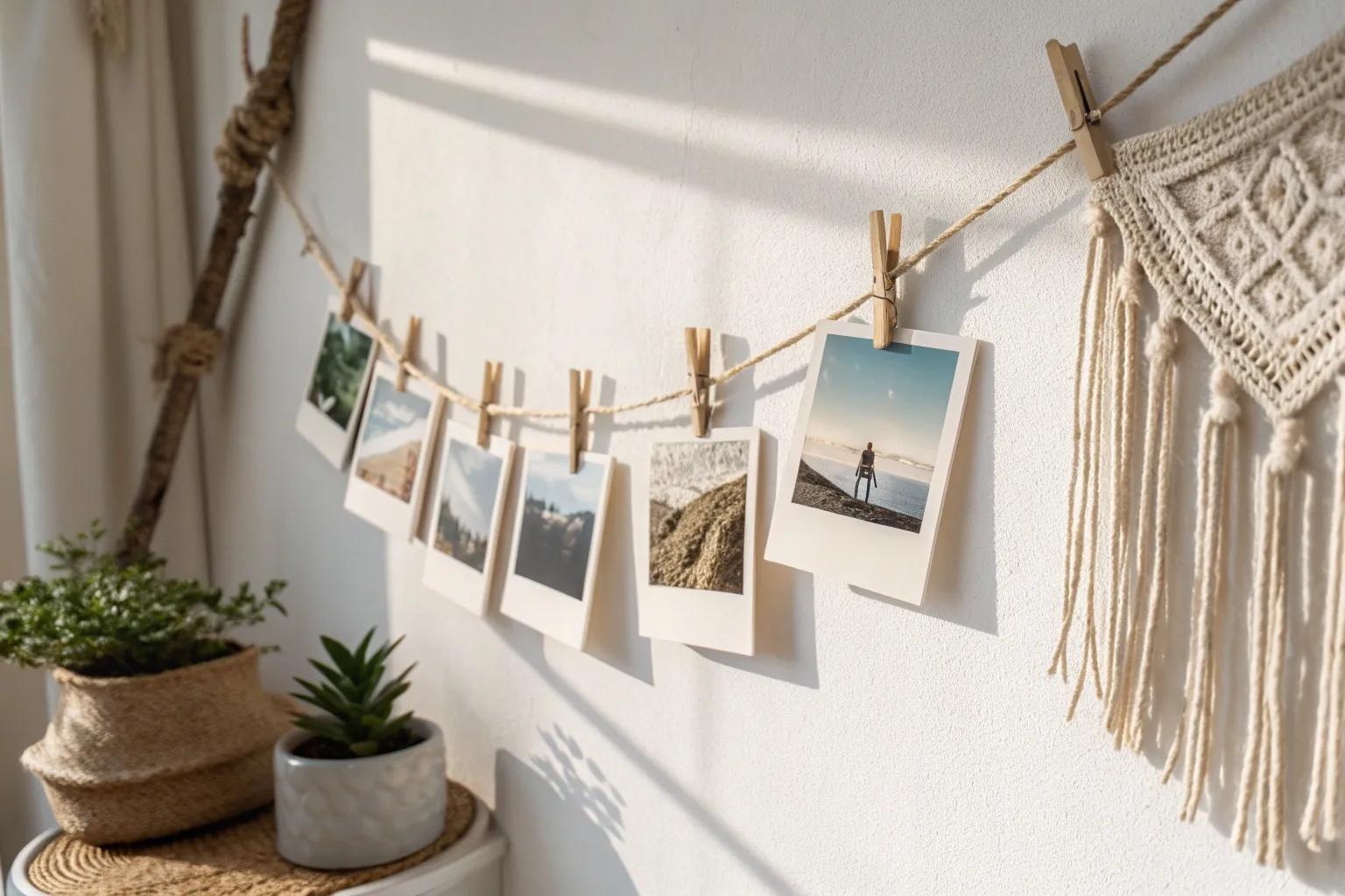 For a little magic, weave fairy lights into your photo string. In the evening, my living room lights up with a warm, cozy glow that makes every picture feel special.