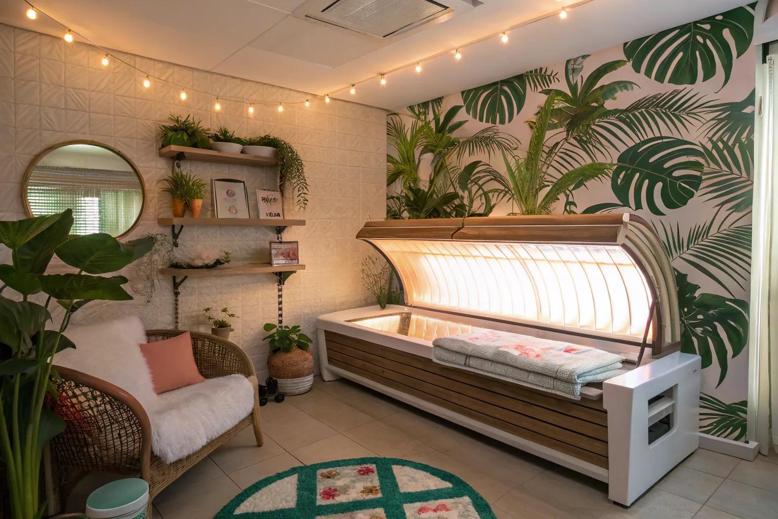 Lush greenery can bring a tropical vibe to your tanning room. I carefully selected easy-to-care-for plants like palms and succulents for a natural touch.