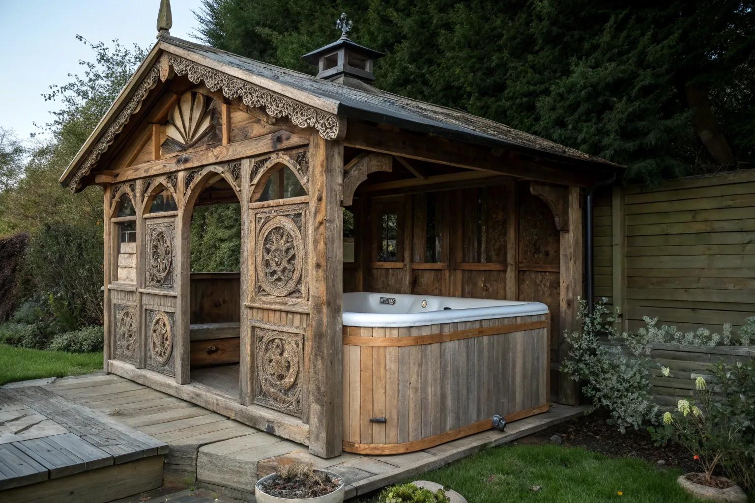 Disguise your hot tub shed as a charming garden cottage. I once camouflaged a shed with climbing plants and it became a hidden retreat.