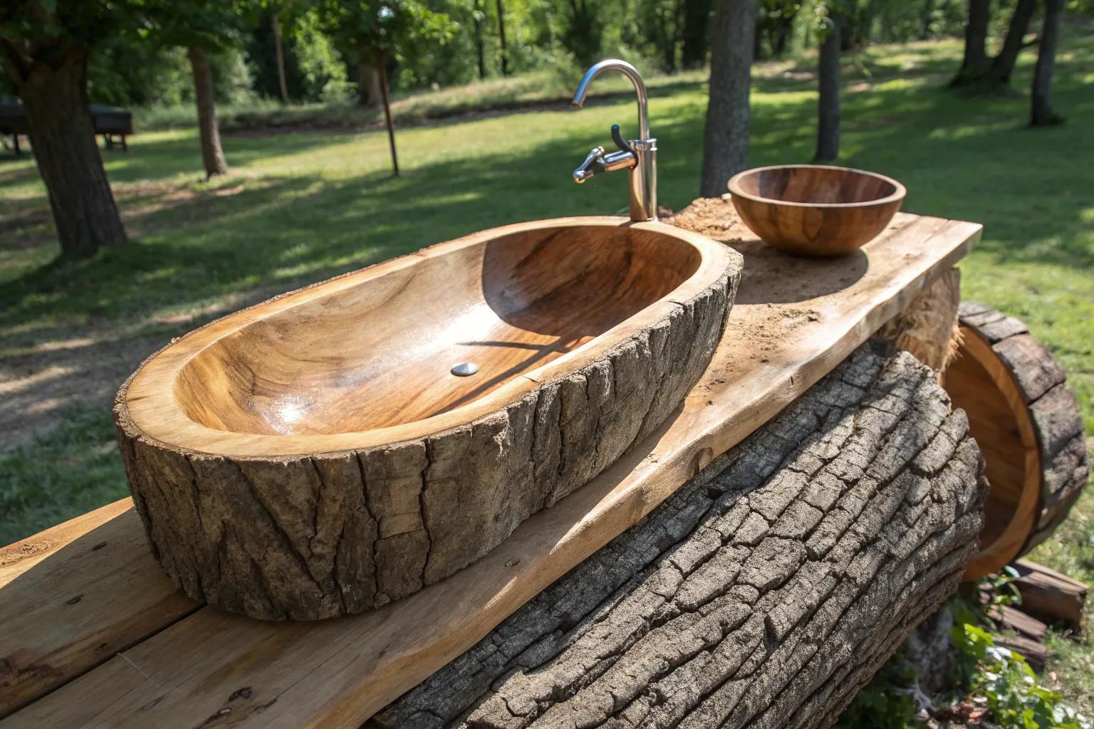 For the adventurous, a hollow log can be repurposed into an outdoor sink. Perfect for rustic-themed gardens or outdoor kitchens.