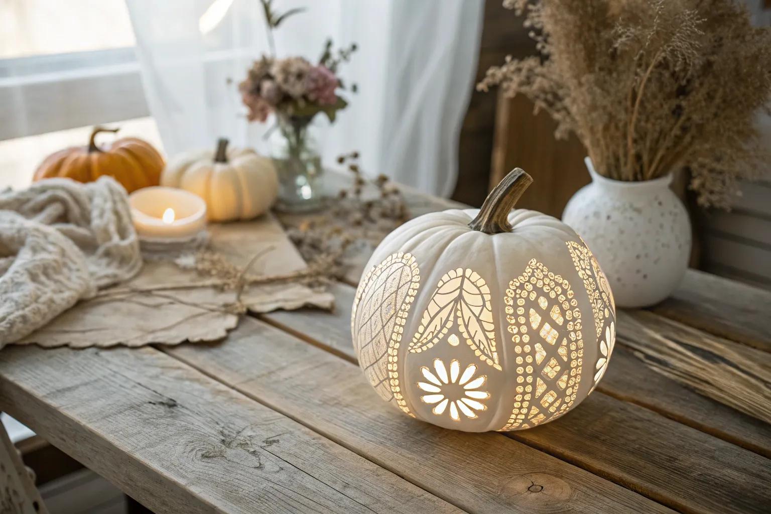Carve fall leaves into your pumpkin for a stylish autumnal glow. I love how the light dances through the intricate patterns, adding elegance to any entryway. Many flower pumpkin carving ideas create a similar effect.