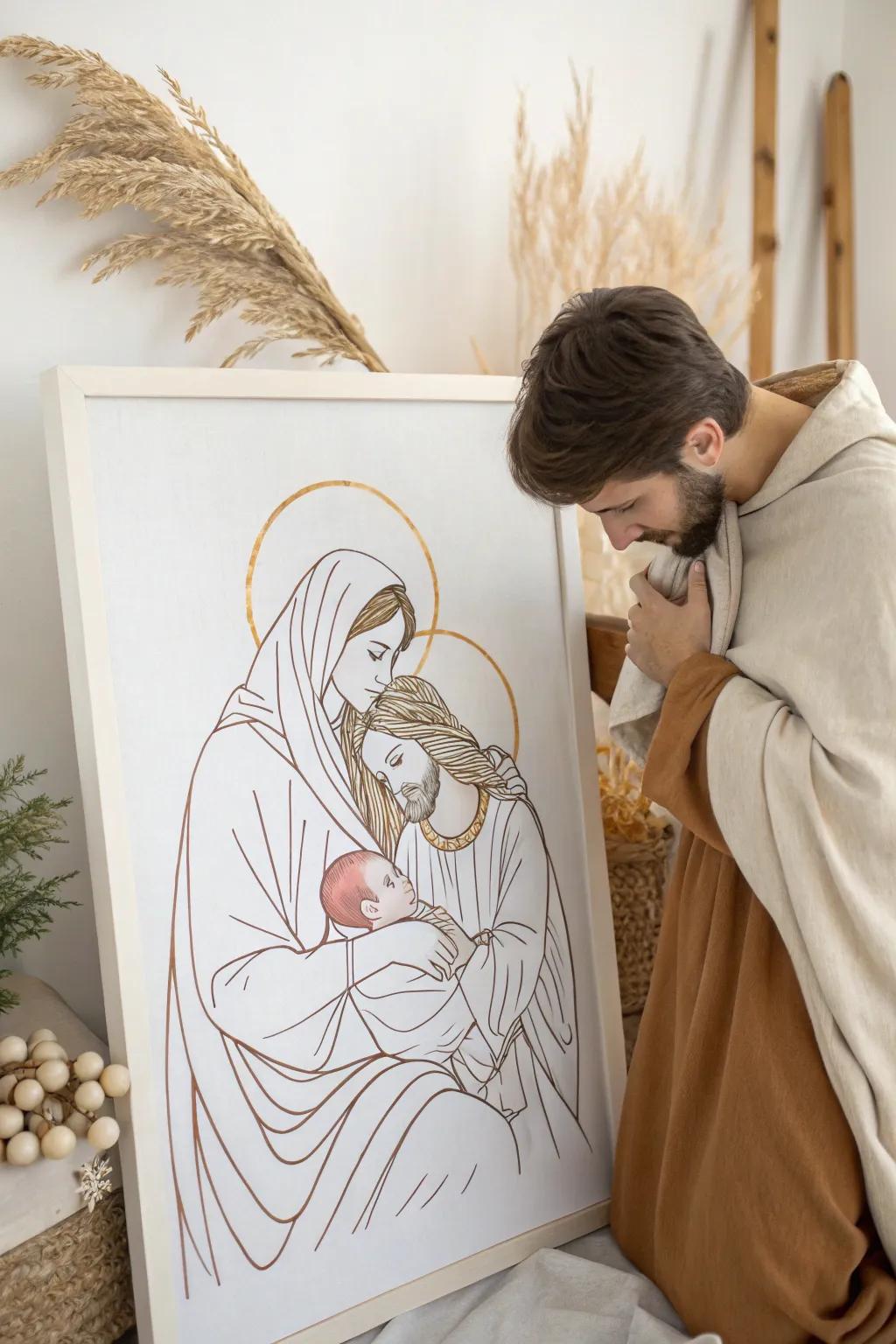 Sketch an intimate portrait of the Holy Family to focus on the love and unity that Christmas represents. This personal touch will resonate with anyone who views it.