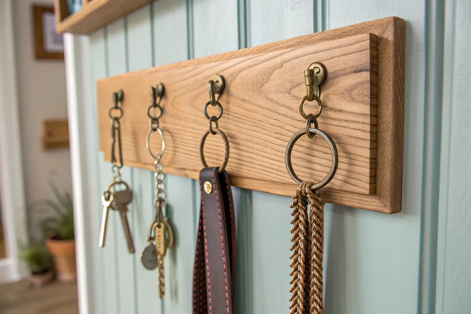 For a touch of rustic charm, consider using a slatted wooden rack. It’s a cozy way to hang keychains, and you can often find these racks at local flea markets or make one yourself from reclaimed wood.