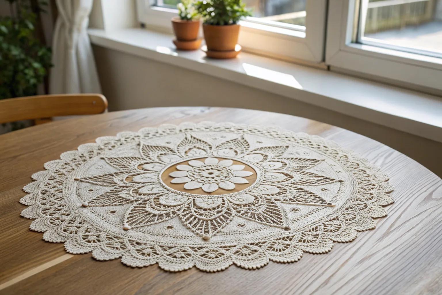 Enhance your dining table with a handmade lace table runner. Stitching doilies together, I’ve created a centerpiece that adds a touch of elegance to every meal, making it a great idea for DIY wedding decor.