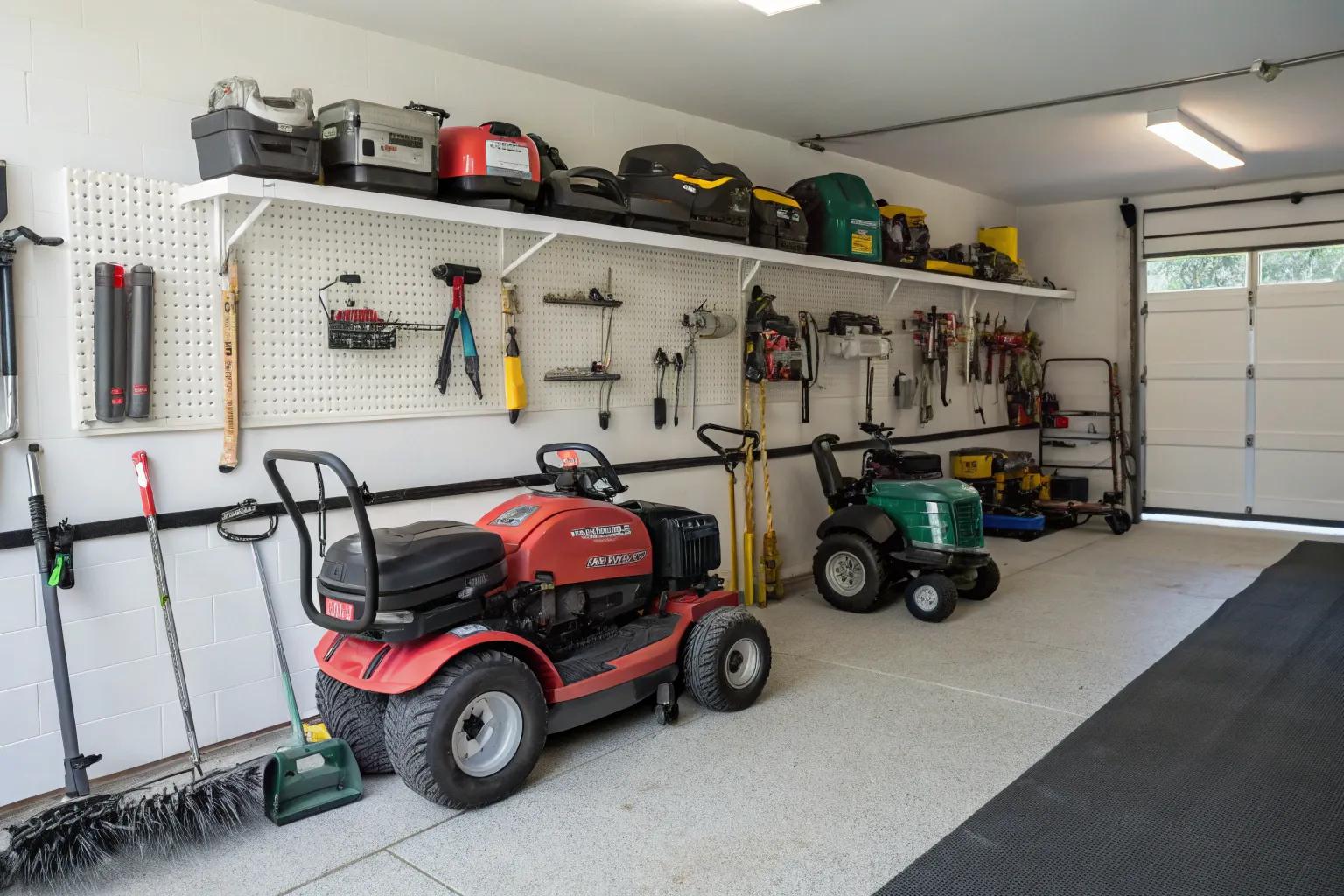 Consider a ceiling hoist system to lift your mower off the ground in the garage. This is a brilliant solution I’ve implemented for clients with limited floor space—just make sure your ceiling is high enough!