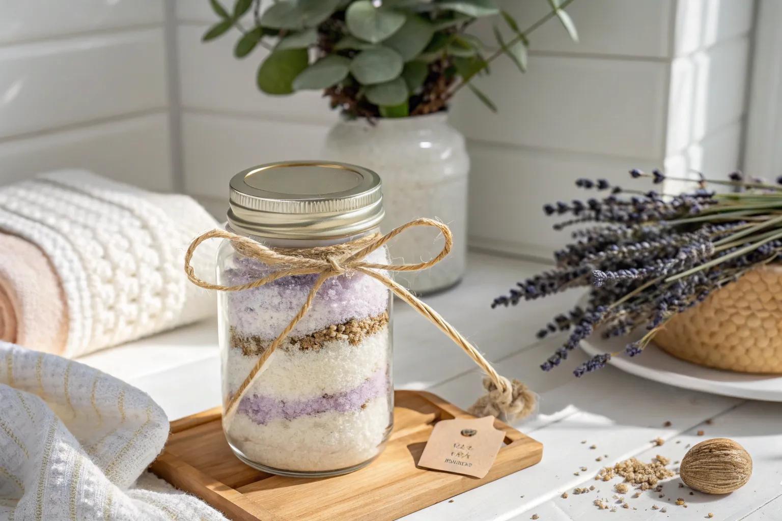 Elevate your bath time with this beautifully crafted jar of homemade bath salts, perfect for a relaxing spa-like experience.