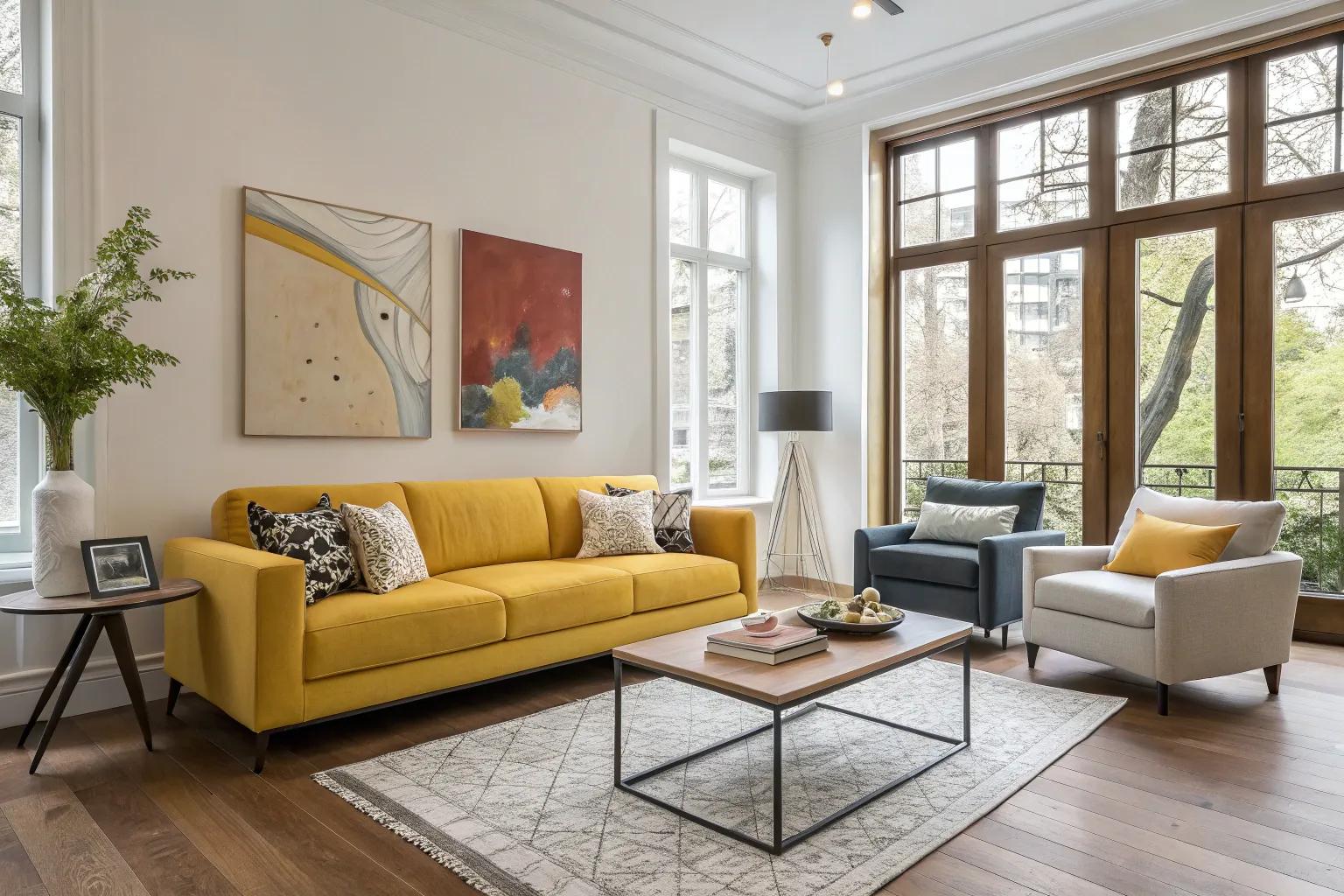 A mustard yellow sofa can add warmth and character to your living room. In my Boston apartment, it’s the perfect color to brighten up those chilly winter days, similar to other vibrant room color ideas.