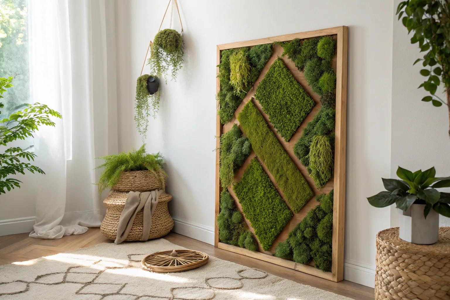 Transform any wall into a lush vertical garden by arranging moss in frames or panels. Similar to other fun moss craft ideas, this is a fantastic way to create a living piece of art that feels like a slice of the forest indoors.