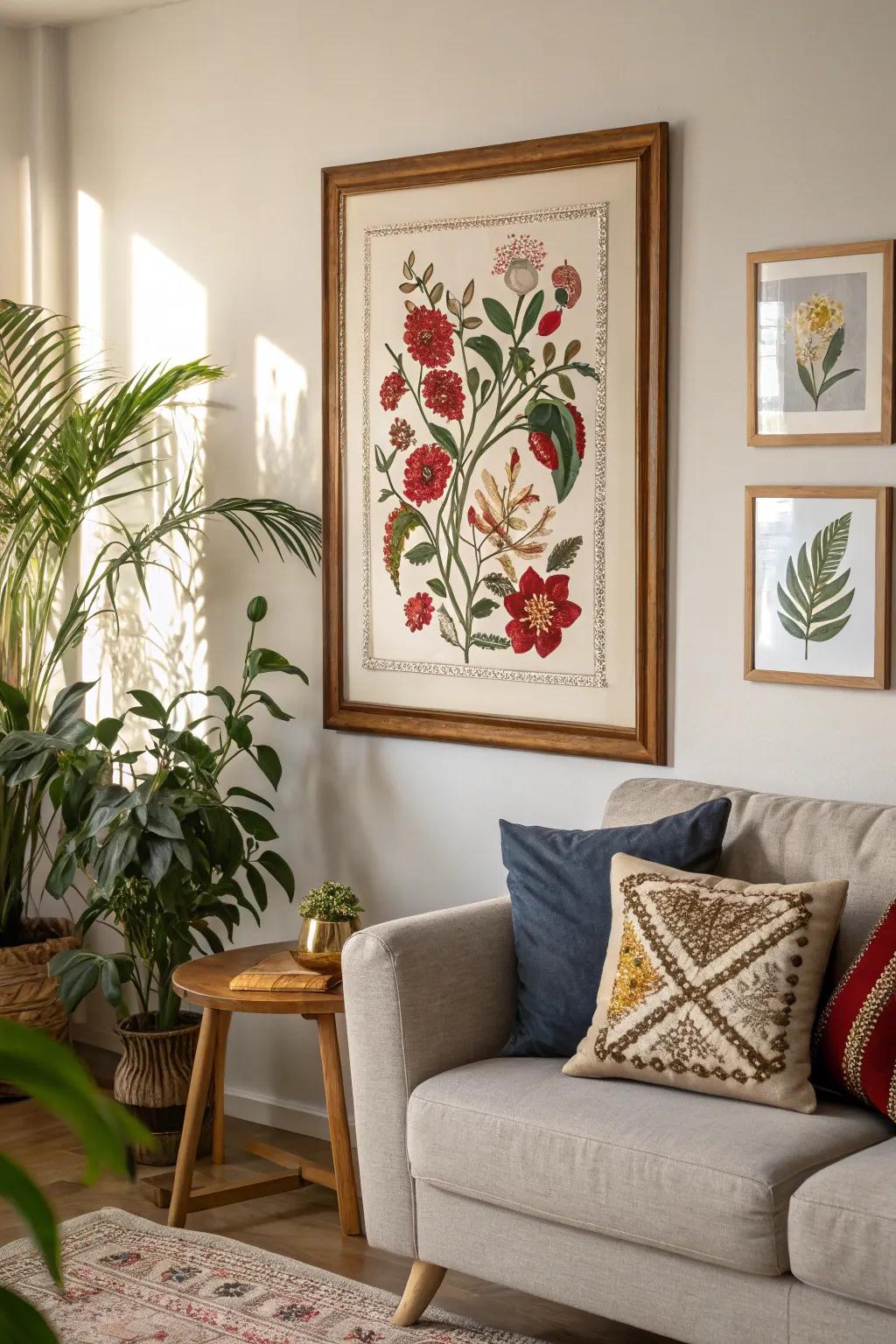 Curate a gallery wall of embroidery art with framed needlepoint pieces for an eclectic look. Mixing different sizes and styles adds interest and personality. It’s a great conversation starter in my home.