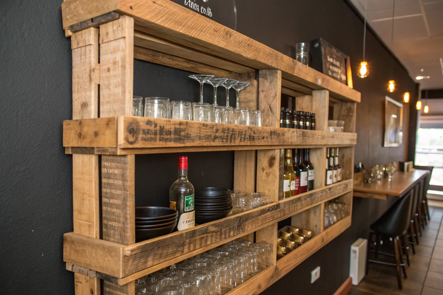 Keep everything organized with a pallet bar featuring extensive shelving. This design turns vertical space into a storage haven, perfect for serious entertainers.