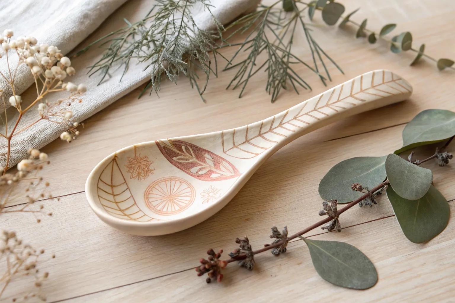 Use real leaves or flowers to create imprinted designs on your spoon rest. This is just one of many creative craft ideas with clay you can try. I enjoy pressing herbs into the clay, leaving behind delicate patterns.