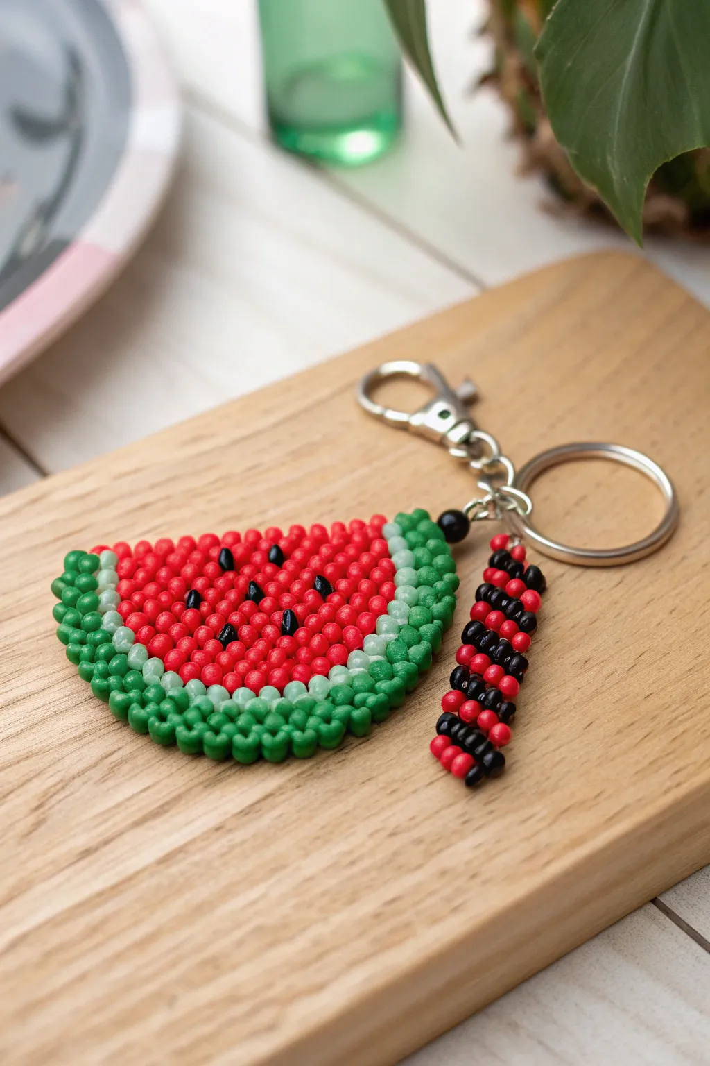 Craft a cute watermelon keychain using pony beads for a splash of summer fun. These little accessories never fail to bring a smile, especially when I hand them out as gifts!