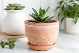 Capture the beauty of mosaic art with geometric terracotta pot ideas and bold colors. I love how this technique adds depth and texture to my ceramics. It’s reminiscent of ancient artworks and always a conversation starter.
