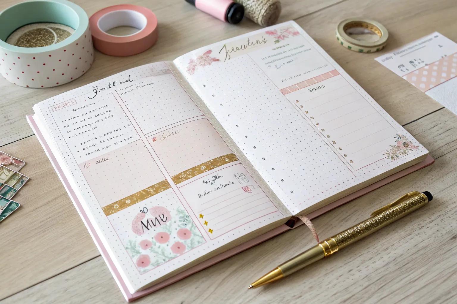 Transform your weekly spreads with creative layouts. Add sections for tasks, priorities, and notes, all adorned with doodles and colors. This approach keeps my weekly planning both effective and exciting.