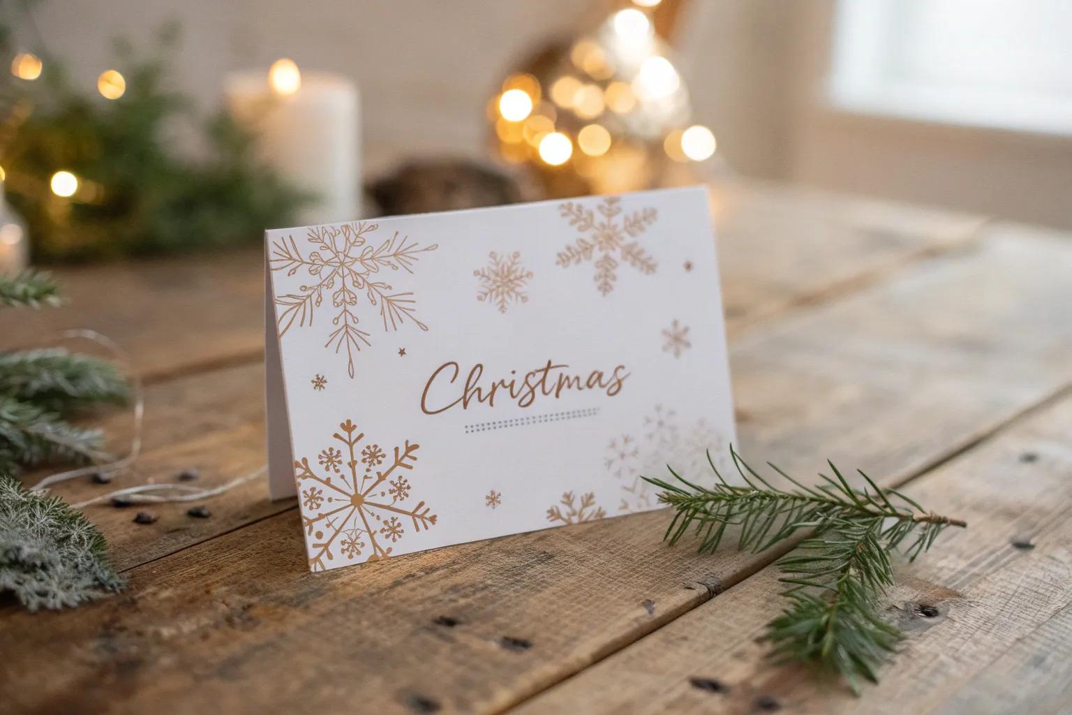 Create a card depicting a serene winter landscape with softly falling snow. This theme is particularly beautiful when using watercolors; see these watercolor Christmas card ideas for techniques. I often find this design to be a calming reminder of the beauty in quiet moments, perfect for sending peace and tranquility.