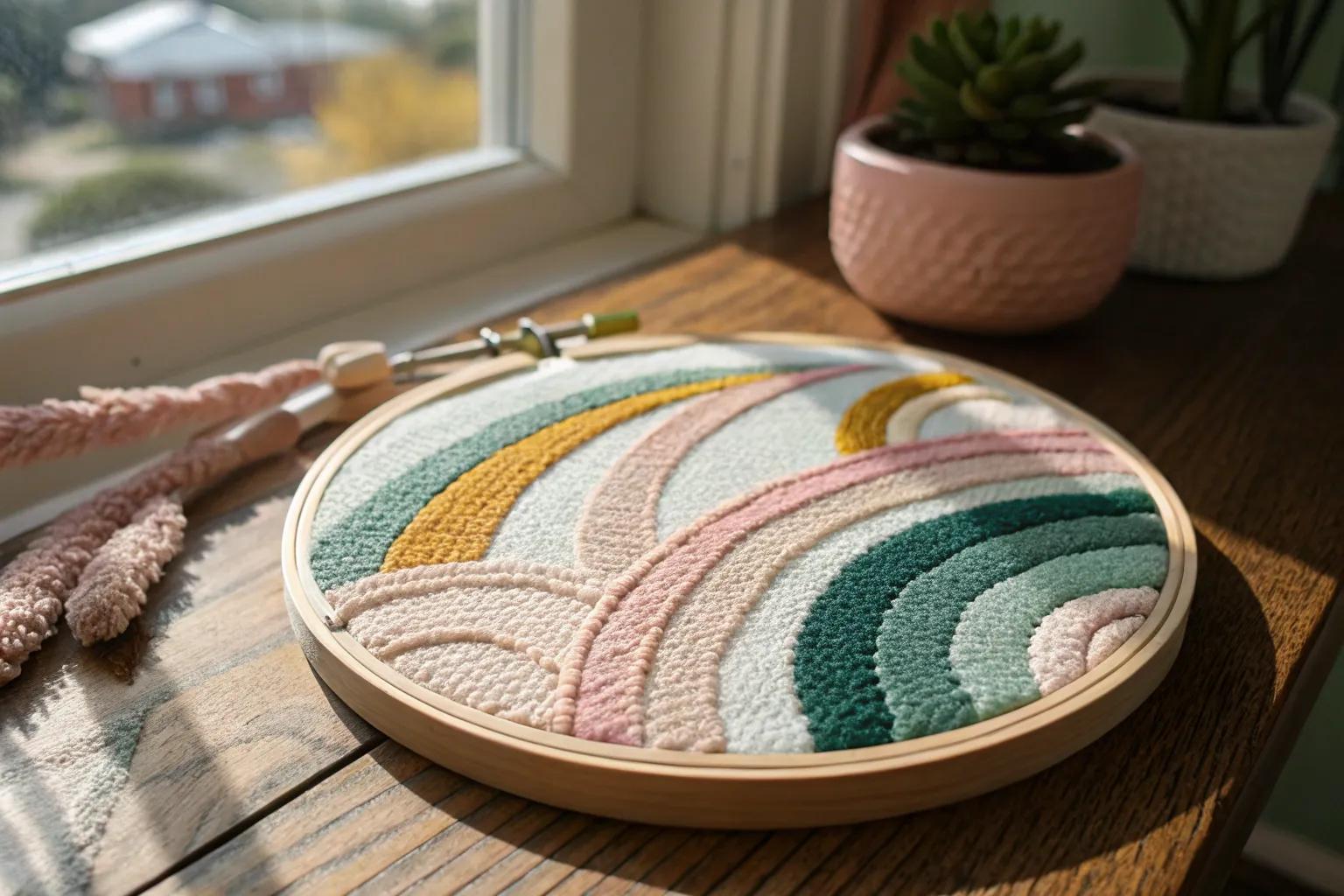 Hang a colorful punch needle hoop on your wall to add a pop of personality to any room. With a little creativity, you can create anything from abstract art project ideas to serene landscapes—I’ve made a few that always receive compliments from guests.