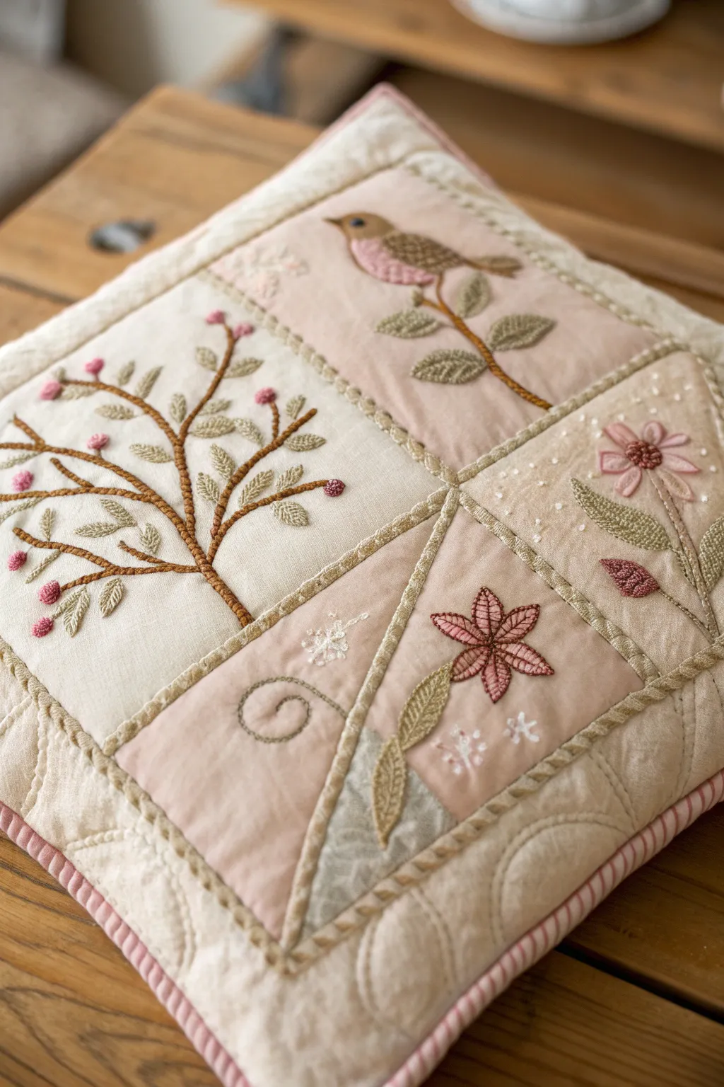 Add embroidery to your quilt squares to tell a story or personalize it. I stitched little motifs on my quilt, making it truly one-of-a-kind.