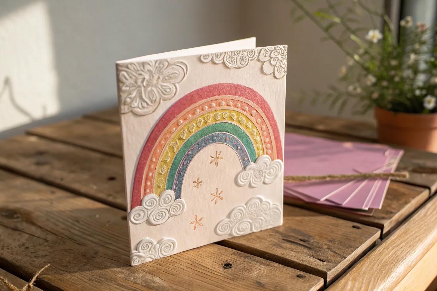 Create a pocket filled with rainbow confetti that bursts out when the card is opened. This playful feature adds an element of surprise and joy. For another handmade rainbow craft, explore these charming crochet rainbow ideas.