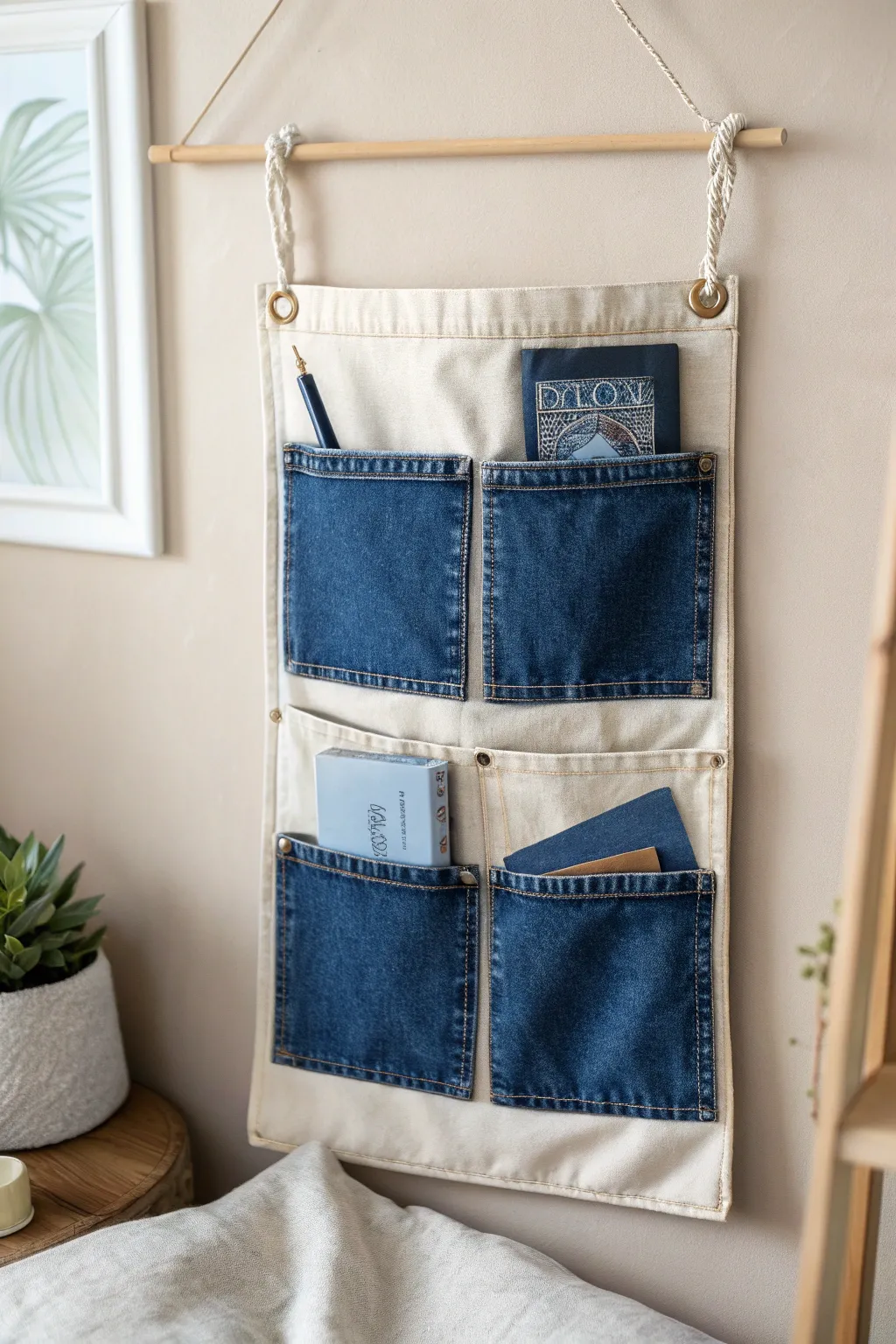 Repurpose old jeans into a handy pocket organizer. Cut out the pockets, sew them onto a fabric backing, and hang for instant storage.