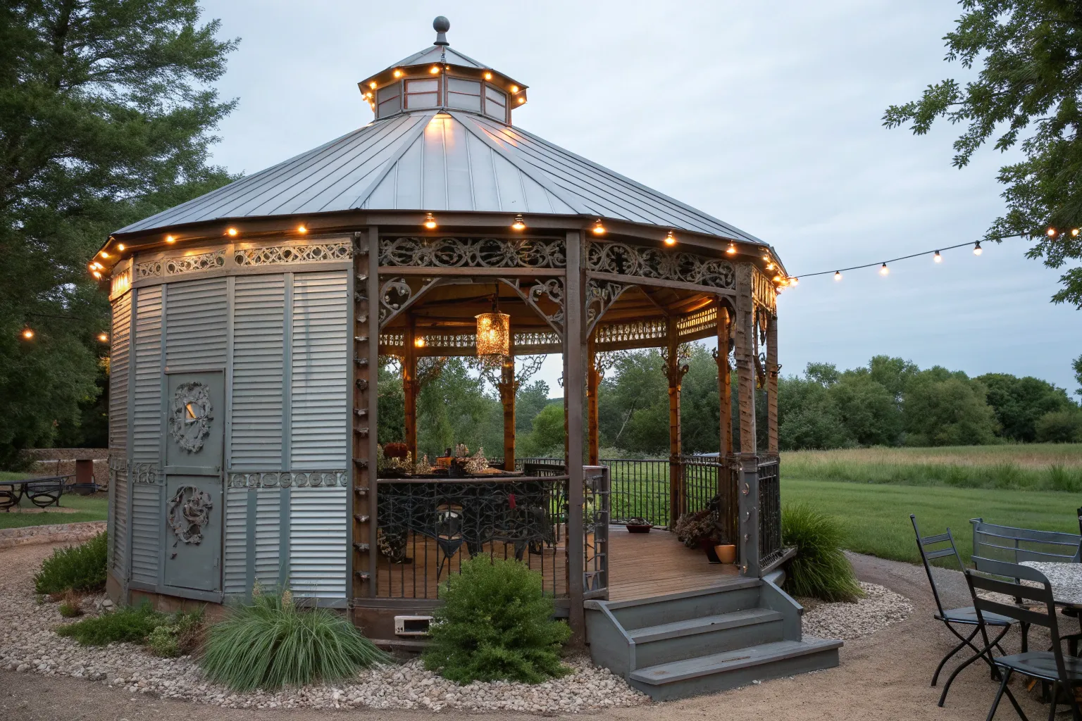 Discover the charm of sustainable design with this repurposed grain bin gazebo—where craftsmanship meets nature.