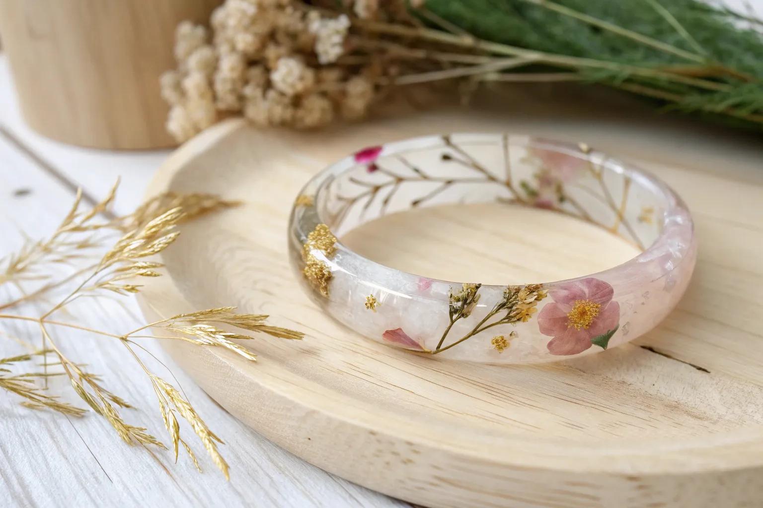 Capture the essence of nature by embedding dried flowers within your resin bracelets. Similar to other nature-inspired resin crafts, I’ve found that adding a touch of greenery always brings a piece to life, making it feel like you’re wearing a mini garden on your wrist.