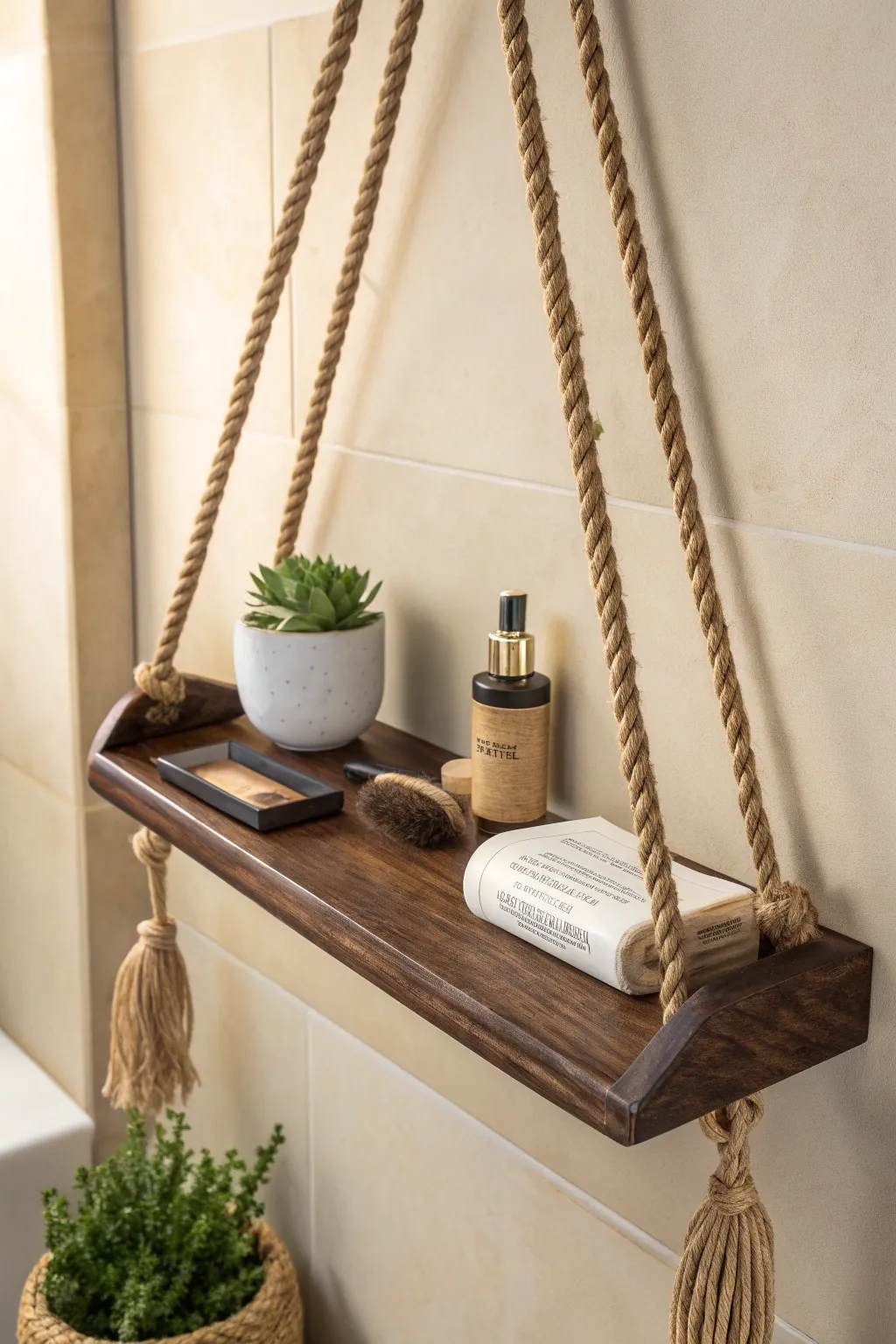 Use a single rope shelf as a floating vanity in small bathrooms. It holds essentials and adds a chic touch without taking up floor space.