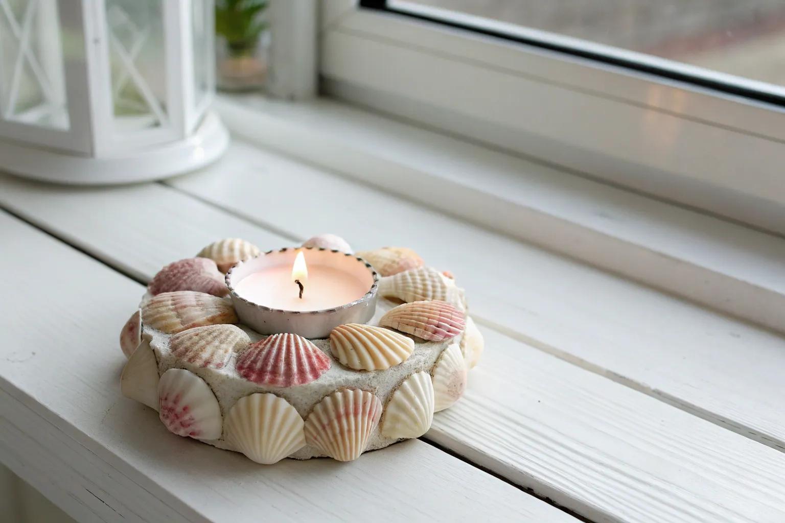 Enhance your candles with a seashell-decorated holder. I like to attach shells around the base to mimic the look of waves crashing on the shore. This is just one of many creative beach craft ideas you can try.