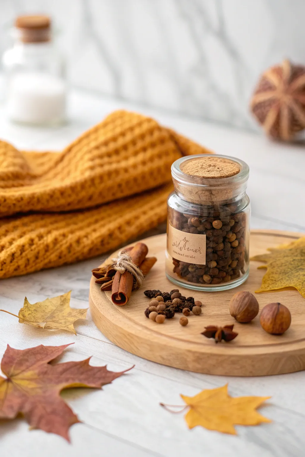 Combine spices like nutmeg and cloves in a small jar for a fragrant delight. Give it a shake and enjoy the scent of fall.