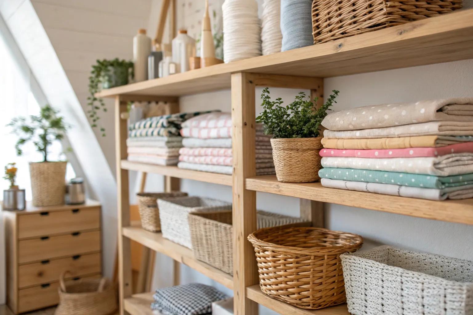 - Wicker Storage Baskets: Enhance shelf organization with charming wicker baskets, ideal for storing sewing supplies.