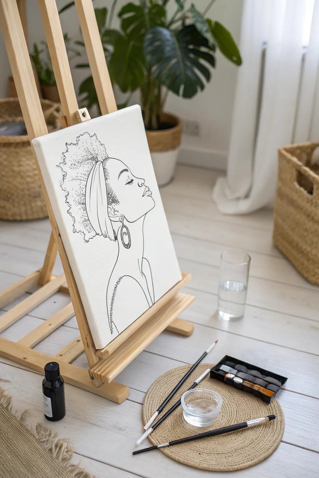 Capture the natural beauty of afro hairstyles with bold outlines that highlight their voluminous and unique textures. This is a powerful theme in many expressive girl art ideas. I love experimenting with different brush techniques to bring these textured hairstyles to life on canvas.