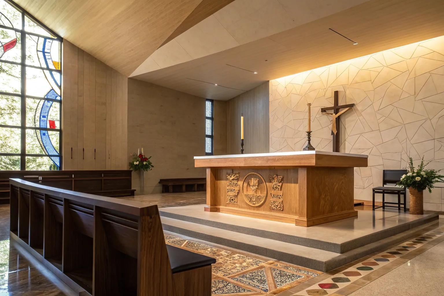 A modern altar with clean lines and a central cross can become a striking focal point. Keep it simple and elegant, and consider adding a stage area for performances or sermons.