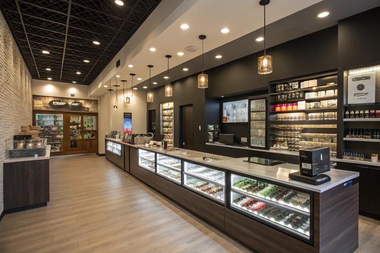 Install modern lighting to highlight products and create ambiance. Using a mix of LED and ambient lights can transform the mood, making the space more inviting and visually appealing. For more ways to achieve this, explore these modern lodge interior design ideas.