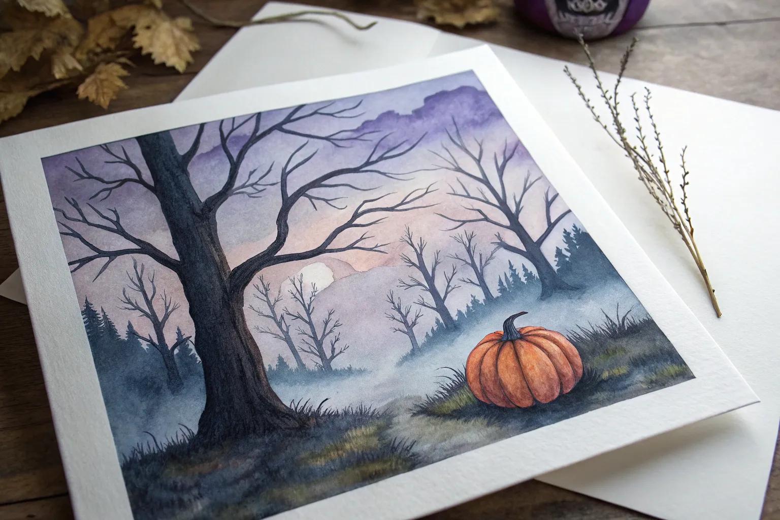 Capture the eerie glow of jack-o’-lanterns in watercolor by layering shades of orange and yellow. I love how these little faces light up the night, perfect for a spooky centerpiece.