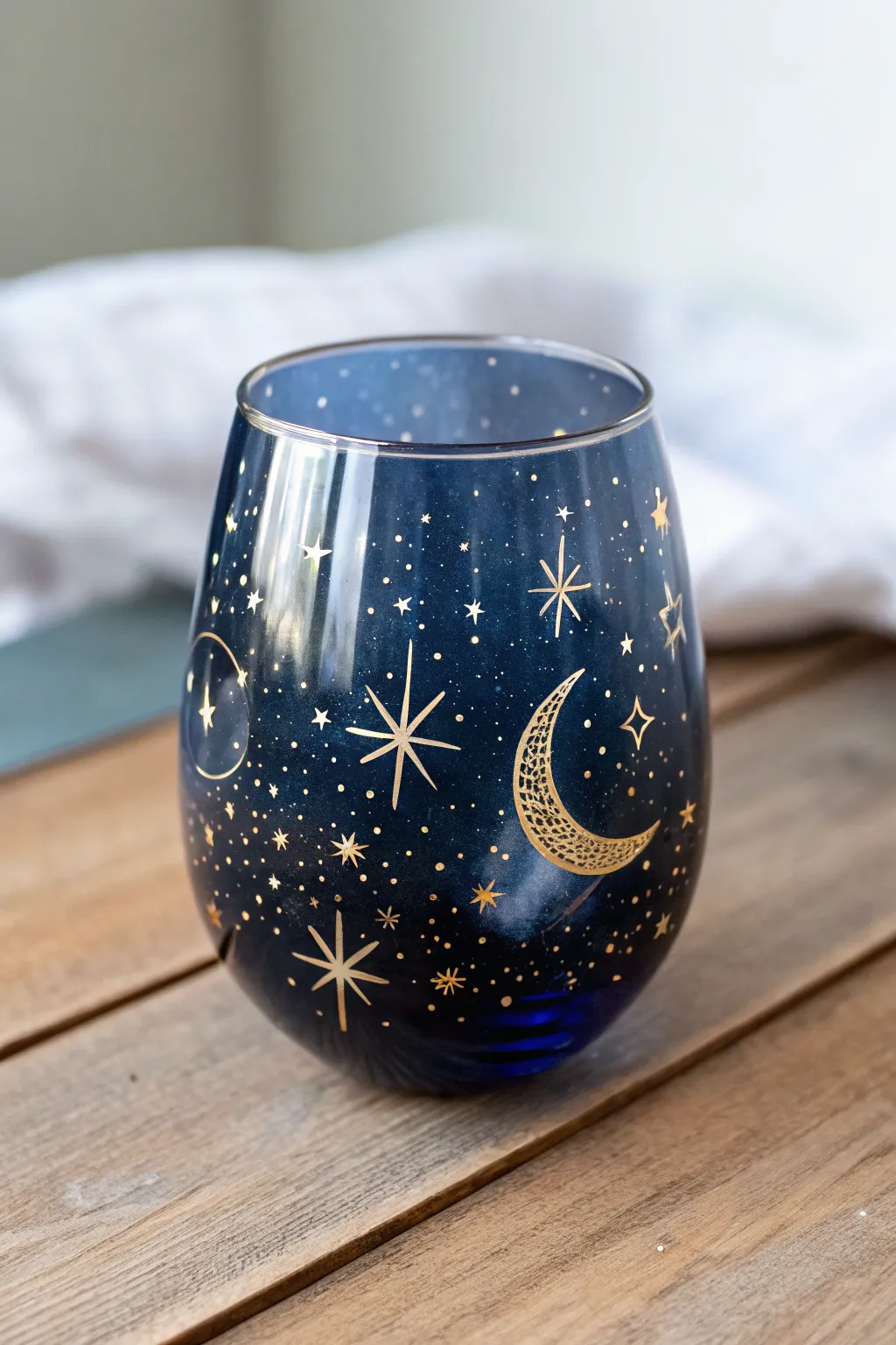 Sip under the stars with this beautifully painted stemless wine glass, where elegance meets creativity.