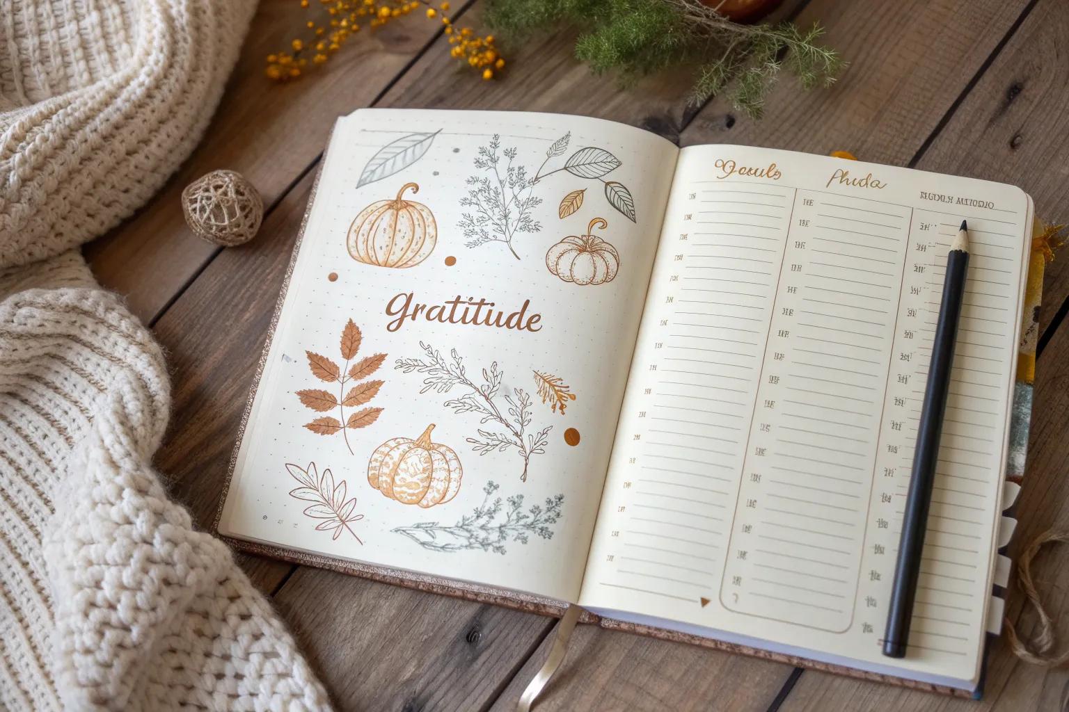 Decorate your pages with leafy borders in shades of brown and gold. These simple additions, reminiscent of a festive DIY Thanksgiving wreath, always make my journal look polished and festive.