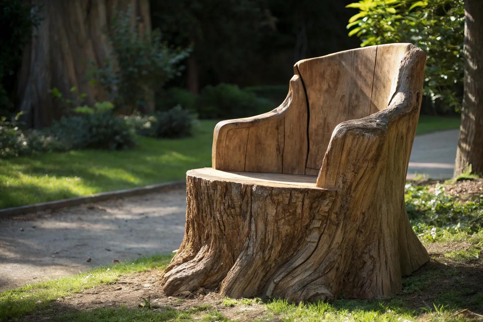 Carve out a design in the backrest for a playful effect. For more inspiration, explore these creative tree stump ideas. I experimented with a leaf motif, and it became a favorite feature in my garden.