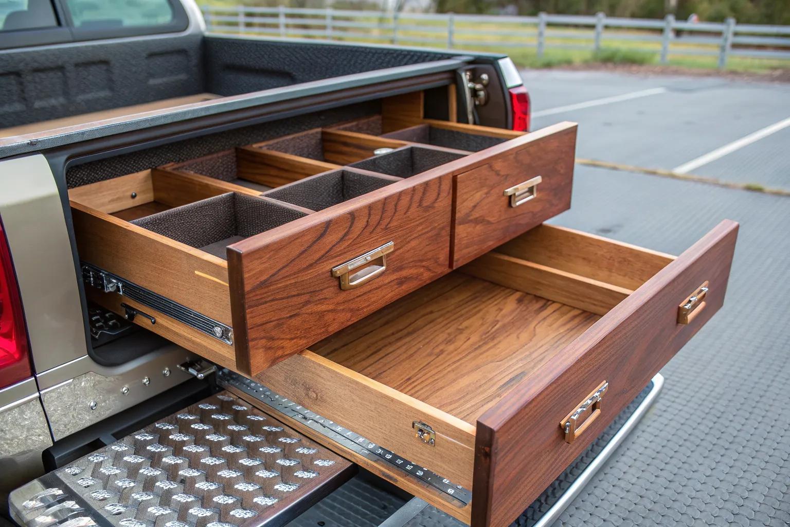 Elevate your truck's functionality with handcrafted slide-out drawers—where craftsmanship meets practicality.